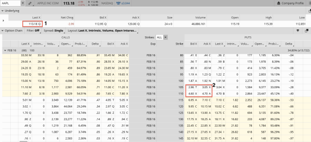 This is Apple stock and it is trading at $113.18 (See 1). As we expect the stock price to go up or flat, we can construct BPCS using two Put Options. In this example, we select 110 strike and 105 strike.