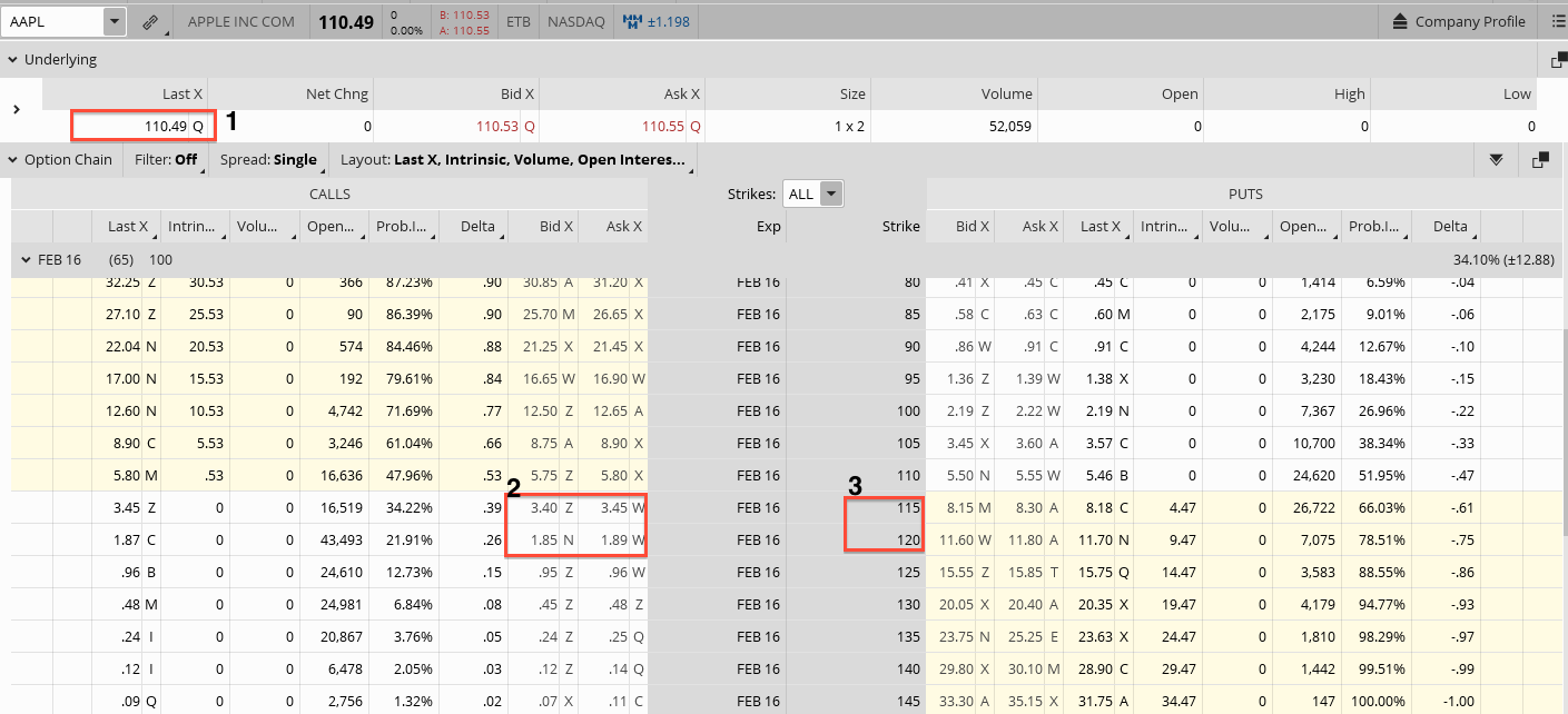 This is Apple stock and it is trading at $110.49 (See 1). As we expect the stock price to go down or flat, we can construct BCCS using two Call Options. In this example, we select 115 strike and 120 strike (See 3).