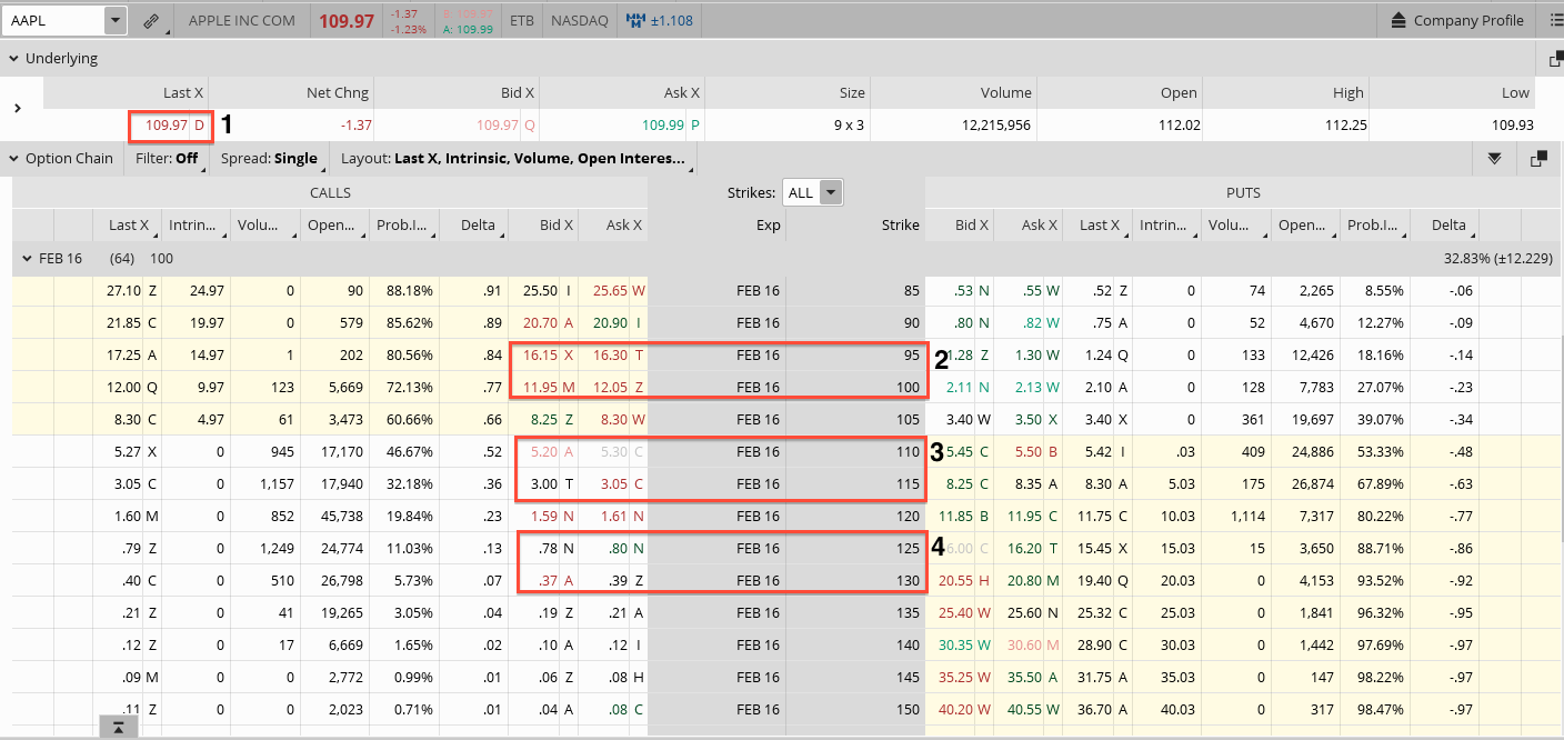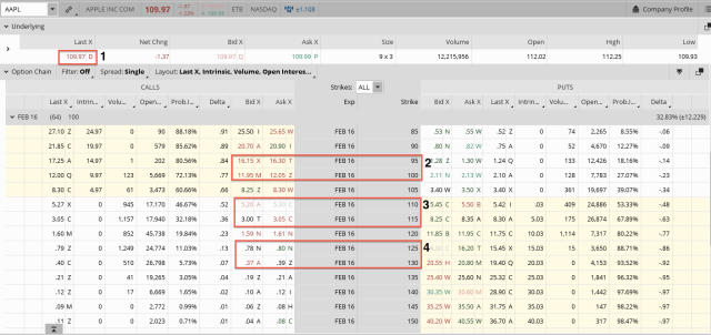 2. Strike 110-115 (See 3), Both Near ATM strikes, Stock/Underlying Price @ $109.97 (See 1)