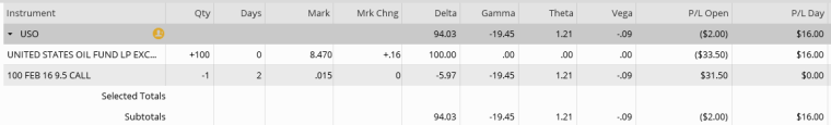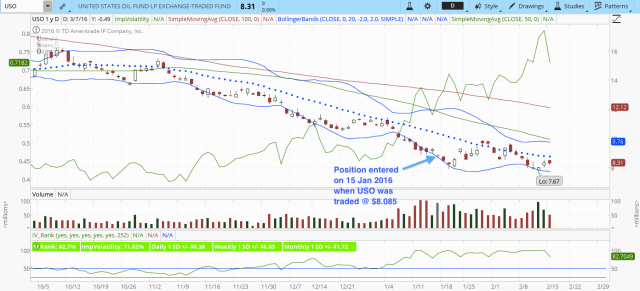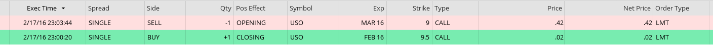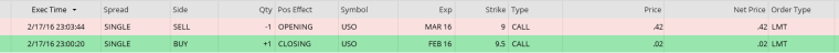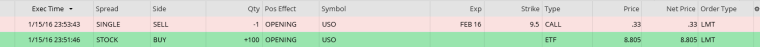 In brief, on 15 Jan 2016, I bought USO underlying stock 100 units @ $8.805 and I subsequently sold USO Call Options (detail in the screenshot) @ $0.33.