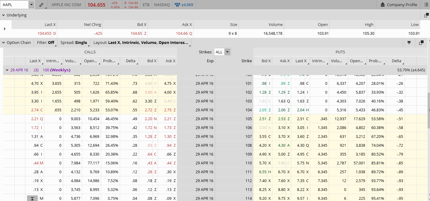 Before the earning news release, AAPL is trading at $104.65 with expected move $4.74. The range of the expected move is $99.91 – $109.39.
